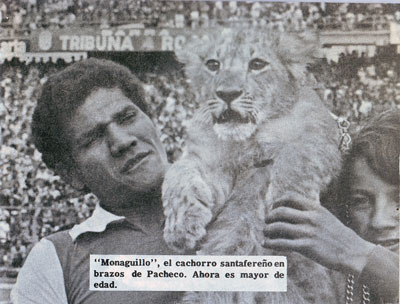 Las mascotas son la otra cara del fútbol, el toque simpático que le da color a la fiesta en los estadios. Por lo general son singulares personajes que se meten en incómodos disfraces que representan una fauna muy diversa. Así apreciamos al Tiburón del Junior, al Cole Pereirano, al novillo Barcino del Huila, el roedor Cuy de Pasto, el Oso de anteojos del Caldas, Nacho el Tigre de Nacional y Monaguillo el León del Santa Fe, entre otros. Éste último ha sido el único caso de una mascota viva y para más señas salvaje en nuestros estadios. Y su historia tiene que ver con Pereira.